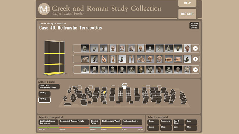 Eliminating the need for paper labels and allowing for the easy removal and relocation of the gallery’s 3,500 prized pieces, Potion created a custom application for the Metropolitan Museum of Art’s Greek and Roman Study Gallery. Potion worked closely with the Met's curators to design the "Object Label Finder". The application invites visitors to search and explore the gallery’s exhibit. Kiosks feature a map with 3D models of each case and its contents. Touching a case brings up photos of every object and its orientation. Visitors can inspect the pieces granularly by selecting an object through high-resolution photos. The program provides museum staff with a user-friendly interface to update their digital collection, visualize the collection, and track relocations and loans. Considering the details involved in the original hand-assembled labels, Potion created custom algorithms that reflect the Met's multiple curatorial formats and their high degree of typographic specificity. Potion’s six kiosks are the first interactive displays incorporated into any of the Met’s permanent galleries.