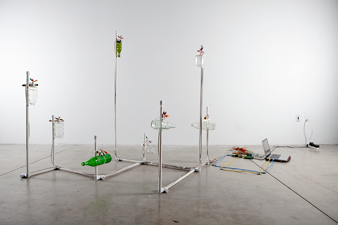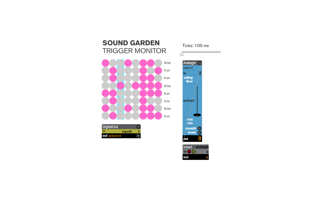 An interactive rhythm machine bestowed within its own evolving cadence that transformed throughout the day. Visitors could affect the rhythm by altering the amount of light each node received.